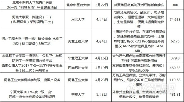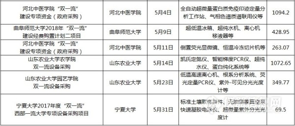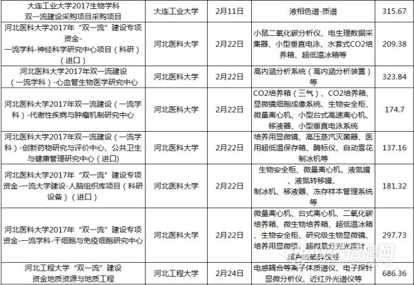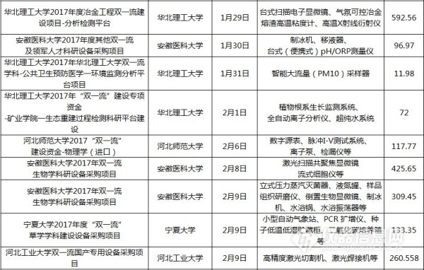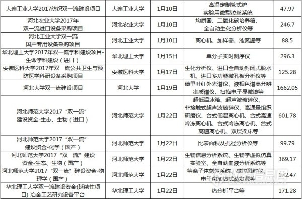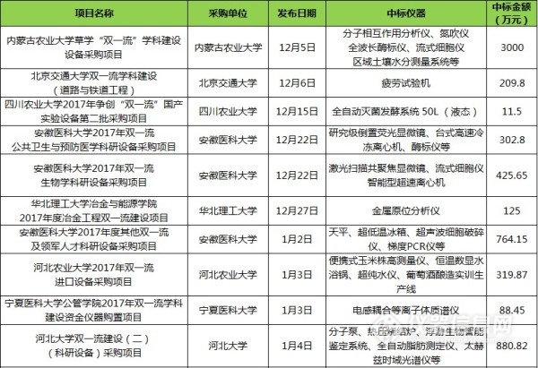儀器相關(guān)“雙一流”中標(biāo)項(xiàng)目列表(2017年12月1日至2018年6月1日)