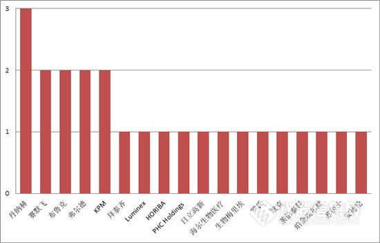 從領(lǐng)域上看,并購交易主要集中在生命科學(xué)領(lǐng)域,總計達到11筆;分析儀器次之,交易數(shù)量累計7筆。上半年,丹納赫集團(含貝克曼庫爾特)的收購數(shù)量暫時領(lǐng)先。進口品牌仍是資本市場的主導(dǎo)者,但萊伯泰科、海爾生物醫(yī)療等國產(chǎn)企業(yè)也有不俗表現(xiàn)。