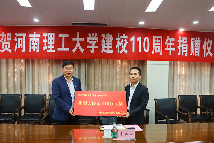 金秋十月,在偉大祖國慶祝建國70周年華誕之際,河南理工大學(xué)迎來了建校110周年慶典,一大批優(yōu)秀的校友們紛紛回校表示對母校的祝賀和感恩。鴻華科技有限公司總經(jīng)理許高云先生回到母校參加了一些列校慶活動,并向母校捐獻110萬元設(shè)立研究生獎學(xué)金;同時鴻華科技有限公司在河南理工大學(xué)材料科學(xué)與工程學(xué)院校友會成立大會上被推選為河南理工大學(xué)材料科學(xué)與工程學(xué)院校友會理事單位。